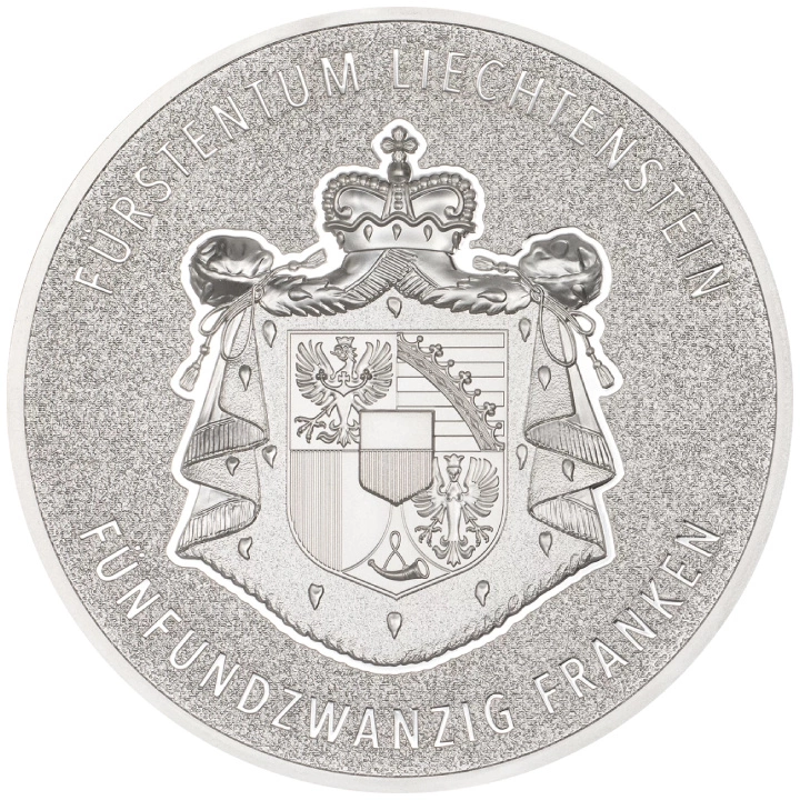 Awers przedstawia herb" FÜRSTENTUM LIECHTENSTEIN". Na awersie znajduje się także informacja o nominale "FÜNFUNDZWANZIG FRANKEN".