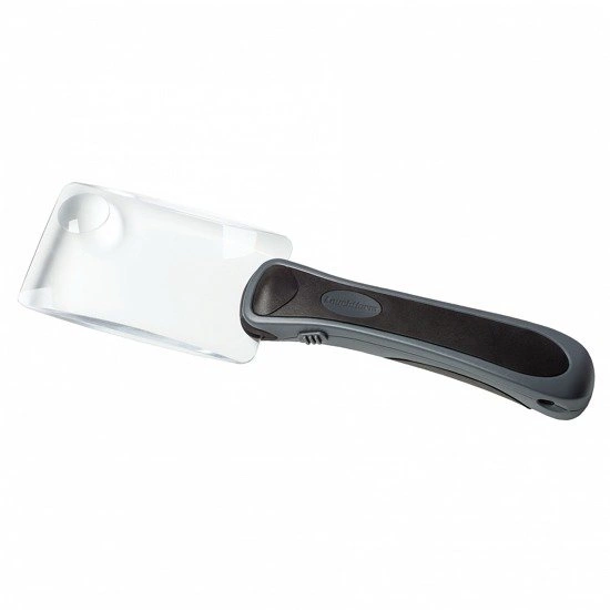 Poręczna Lupa z uchwytem o 2-krotnym powiększeniu stanowi idealne urządzenie do użytku domowego. Lupa posiada prostokątną bezbramkową soczewkę o wymiarach 90 x 55 mm. W górnej części soczewki znajduję się zintegrowana mała soczewka o średnicy 19 mm oraz 6-krotnym powiększeniu. Lupa została wyposażona w dwie diody LED. W komplecie oprócz lupy znajdują się 3 baterię SR1130 oraz służący do ochrony soczewki miękki pokrowiec.
