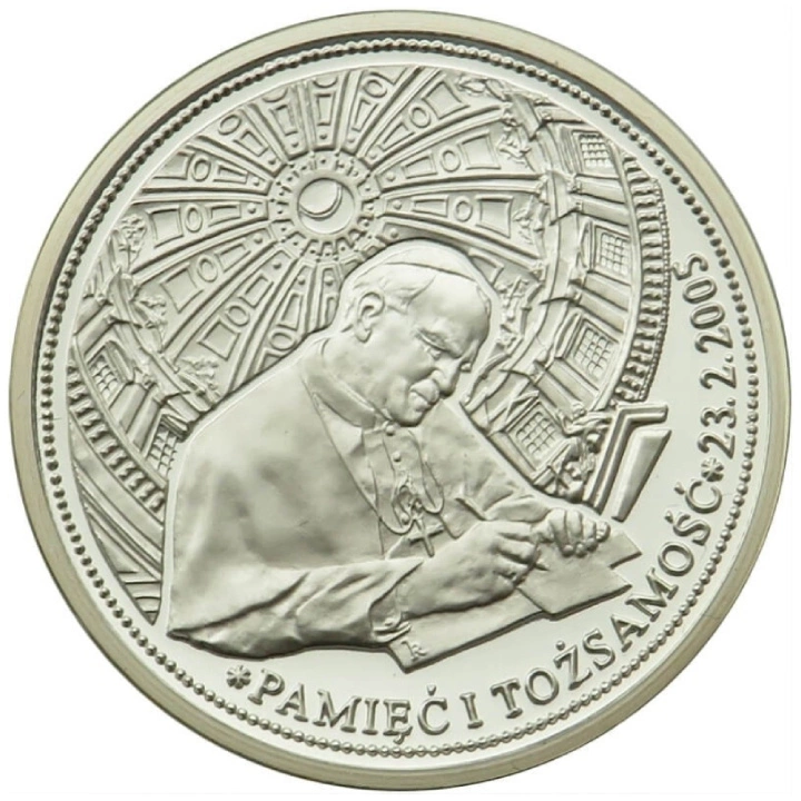 Medal Jan Paweł II - Pamięć i Tożsamość 23.2.2005 to wyjątkowy walor upamiętniający papieża, który przez całe swoje życie kształtował historię Kościoła oraz świata. Medal ten został wydany z okazji rocznicy papieskiej książki "Pamięć i Tożsamość", będącej zbiorem jego przemyśleń na temat historii, tożsamości narodów i ich przyszłości.