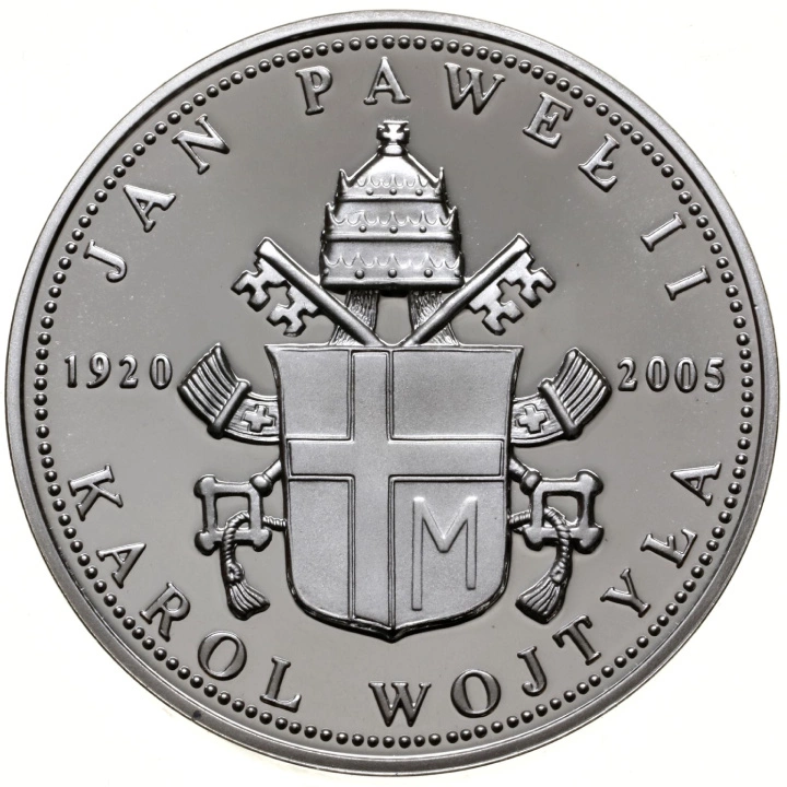 Na rewersie widnieje herb Jana Pawła II, a także napisy „JAN PAWEŁ II” oraz „KAROL WOJTYŁA”.