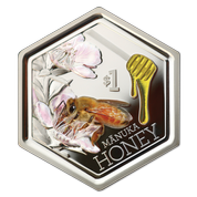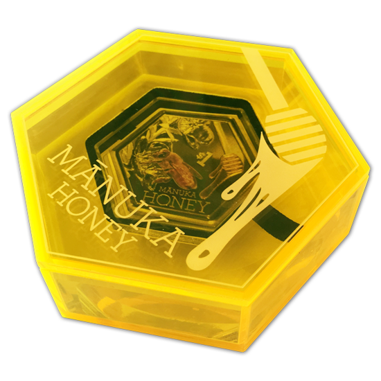 Srebrna moneta Miód Manuka kolorowany 1 uncja Srebra 2018 Proof to egzemplarz, który wyróżnia się nietuzinkowym designem oraz oryginalnym kształtem. Kolekcjonerska moneta z roku 2018 została wybita w kształcie plastra miodu o próbie kruszcu Ag.999 oraz wadze jednej uncji trojańskiej, w standardzie proof. Wymiary produktu wynoszą 46mm x 40mm.