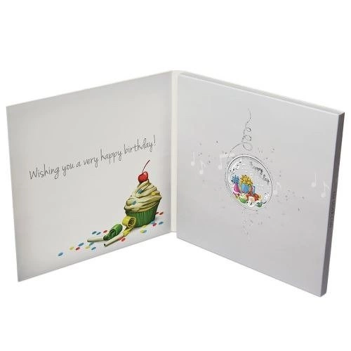 Moneta zapakowana jest w opakowanie przypominające kartkę urodzinową. W mennicy bita na zamówienie! Wizerunek zaprojektowany przez Jennifer McKenna.