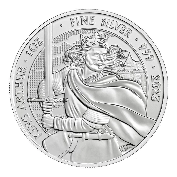 Srebrna moneta Myths & Legends: King Arthur 1 uncja Srebra 2023 ukazuje władcę historycznej Brytanii Króla Artura, bohatera niezliczonej liczby legend, dzieł literackich i filmów. Znany jest między innymi ze słynnego dzieła "Rycerze okrągłego stołu".