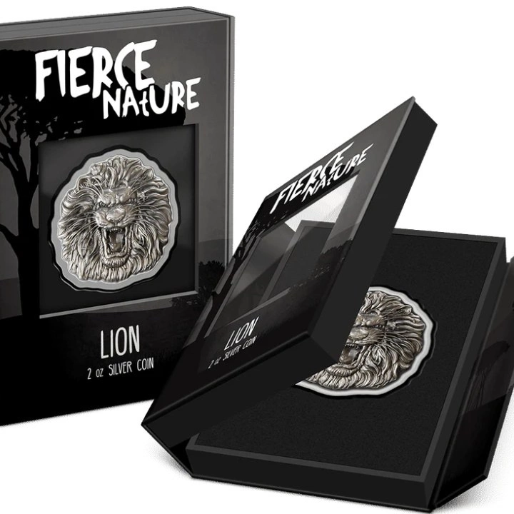 Niue: Fierce Nature - Lion 2 uncje Srebra 2022 Antique Finish to srebrny, bulionowy egzemplarz z serii "Fierce Nature", który przedstawia głowę lwa. Ta wyjątkowa emisja posiada ściśle limitowany nakład liczący jedynie 2 000 sztuk.