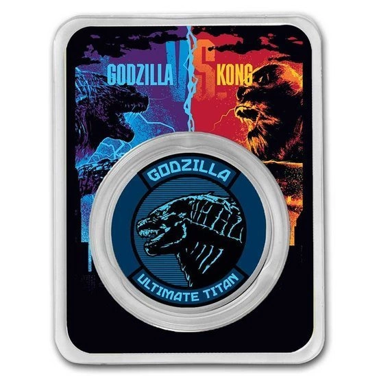 Niue: Godzilla kolorowany 1 uncja Srebra 2021 to srebrna moneta, która jest częścią kolekcji Godzilla vs. King Kong. Ten kolorowy egzemplarz jest produkowany z czystego srebra próby Ag.999, o wadze jednej uncji trojańskiej oraz średnicy liczącej 39 mm. Co ważne, srebrny produkt posiada limitowany nakład liczący zaledwie 10 000 sztuk, a co więcej każda sztuka jest dostarczana w prezentacyjnym slabie.