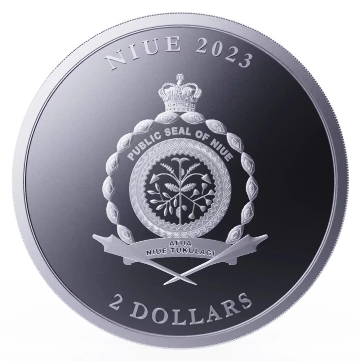 Awers srebrnej monety przedstawia herb Niue oraz informacje o dacie emisji, wartości nominalnej i kraju emitenta.