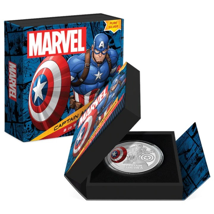 Rewers ukazuje Kapitana Amerykę z kolorowaną tarczą, napis "CAPTAIN AMERICA" i informacje na temat wagi, czystości kruszcu.