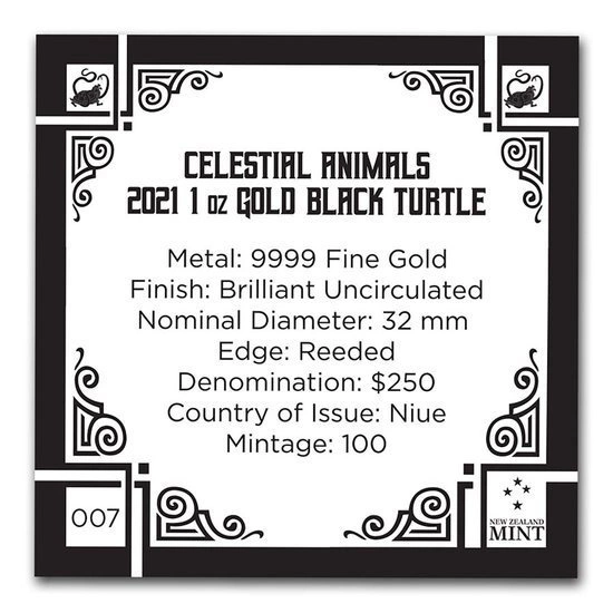 Złoty, jednouncjowy żółw został wybity z czystego kruszcu próby Au.9999. Za jego wybicie odpowiada znany producent wyrób lokacyjnych - New Zealand Mint. Co ważne, złota moneta z 2021 roku jest bita w bardzo niskim nadkładzie, liczącym 100 sztuk oraz jest dostarczana w ekskluzywnym etui wraz z certyfikatem autentyczności.