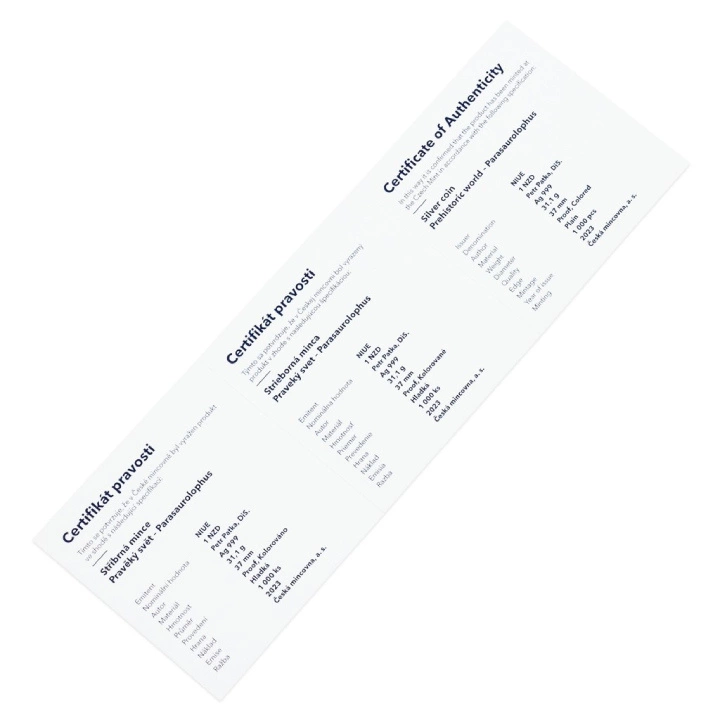 Niue: Prehistoric World - Parasaurolophus kolorowany $1 Srebro 2023 Proof jest piątą monetą z serii "Prehistoric World". Moneta przedstawia prehistorycznego, roślinożernego dinozaura. Zwierzę żyło około 76-72 mln lat temu. Dinozaur poruszał się na czterech łapach oraz posiadał charakterystyczny kaczy dziób wraz z grzebieniem. Waga prehistorycznego zwierzęcia sięgała nawet do 5t, a długość ciała około 9,5 m.