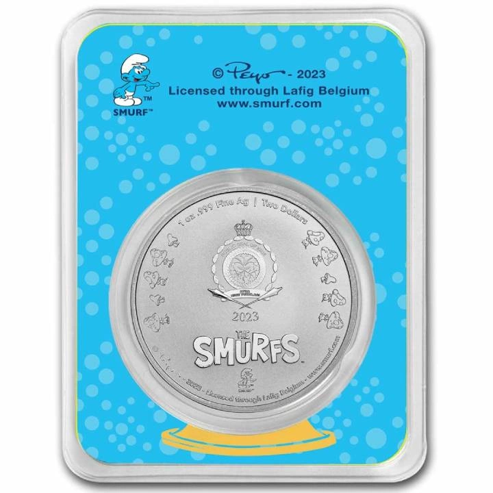 Niue: Smurfs Christmas Carol kolorowany 1 uncja Srebra 2023 Slab to srebrny egzemplarz, który może wzbogacić kolekcjonersko-inwestycyjne portfolio kupca. Smerfy to belgijska seria komiksów skupiająca się na fikcyjnej kolonii małych, niebieskich, humanoidalnych stworzeń, które żyją w leśnych domach w kształcie grzybów.