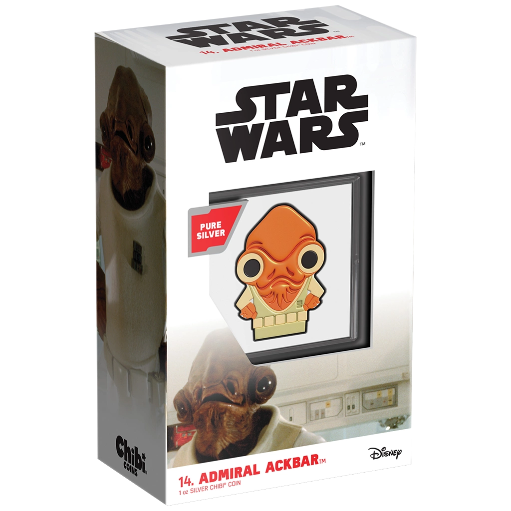 Admiral Ackbar Chibi Coin kolorowany 1 uncja Srebra 2022 Proof to moneta wydana w ramach serii Star Wars – Chibi Coins. Moneta przedstawia postać admirała Ackbara w charakterystycznym stylu Chibi, czyli z dużą głową i stosunkowo małym ciałem, co nadaje postaci uroczy i zabawny wygląd. Moneta została wybita z jednej uncji 99,9% srebra w jakości proof przez New Zealand Mint. Limitowana emisja wynosi 2 000 sztuk na całym świecie, a każdy egzemplarz jest dostarczany w oryginalnym pudełku wraz z certyfikatem autentyczności.