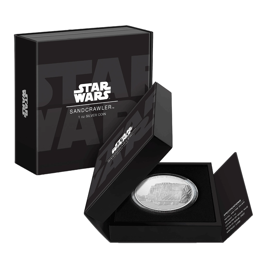 Niue: Star Wars - Sandcrawler 1 uncja Srebra 2022 Proof to druga moneta z ekskluzywnej serii monet poświęconym Gwiezdnym Wojnom - Star Wars Vehicles. Moneta z 2022 ukazuje sandcrawlera, czyli piaskoczołga, który przemieszcza się po piaszczystej planecie Tatooine. Pojazd występuje w czwartej części Star Wars Nowa Nadzieja. Srebrna moneta Star Wars to prawdziwa gratka dla fanów kultowej serii filmów George'a Lucas'a, którzy szukają pewnej i sprawdzonej inwestycji. Walory zostały wybite z czystego srebra próby Ag.999 o wadze 1 uncji trojańskiej oraz średnicy wynoszącej 40mm, w standardzie proof.