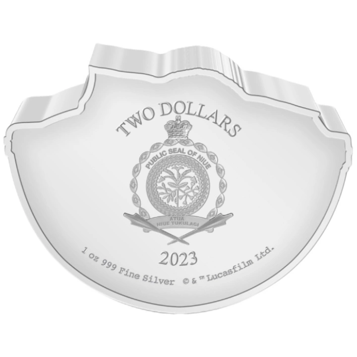 Awers srebrnej monety przedstawia herb Niue oraz informacje na temat wartości nominalnej, roku emisji ,wagi i czystości kruszcu oraz praw autorskich należących do Lucas film Ltd.