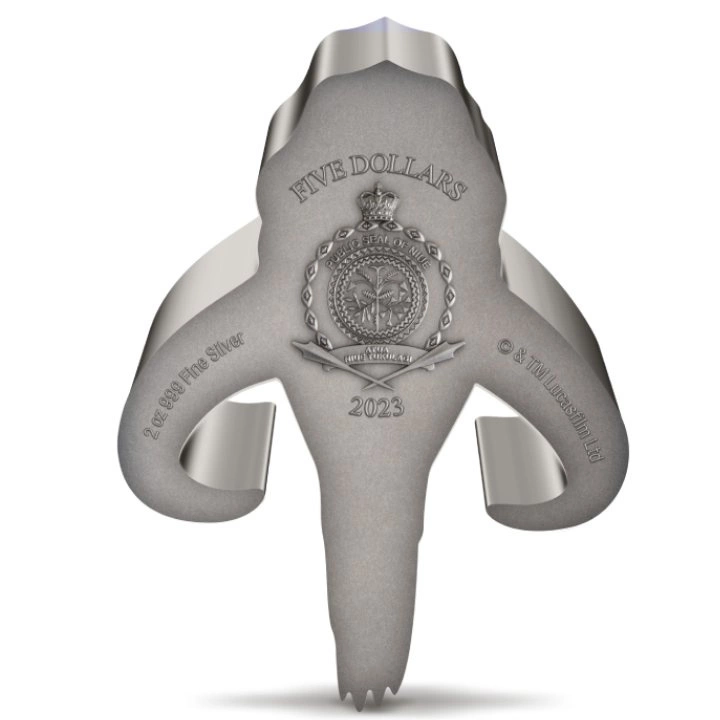Awers srebrnej monety przedstawia herb Niue oraz informacje na temat wartości nominalnej, roku emisji ,wagi i czystości kruszcu oraz praw autorskich należących do Lucas film Ltd.