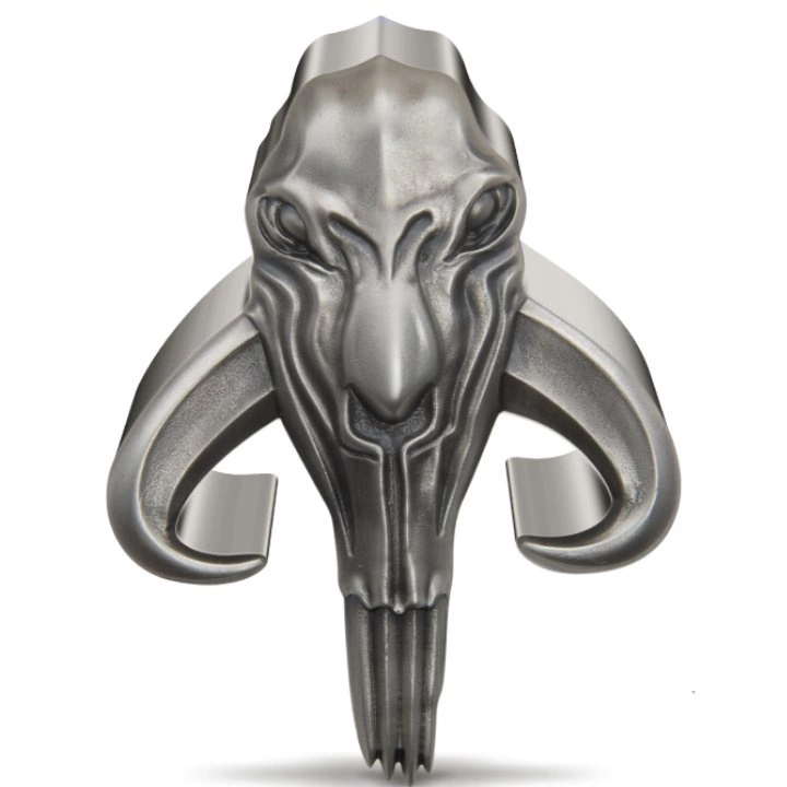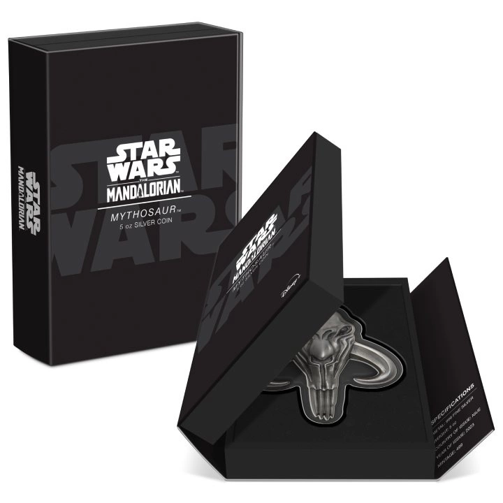 Niue: Star Wars The Mandalorian - Mythosaur 5 uncji Srebra 2023 Antiqued Shaped Coin to moneta z serii "The Mandalorian" przedstawiającą Mytozaura, który zamieszkuje planetę Mandalorę na Zewnętrznych Rubieżach. Postać pojawia się w serialu "The Mandalorian" wyprodukowany przez Lucasfilm Ltd.