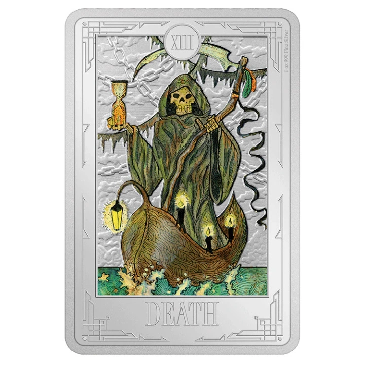 Niue: Tarot Cards - Death kolorowany 1 uncja Srebra 2023 Proof to moneta z serii "Tarot Cards" przedstawiająca obraz "Śmierci”, która jest kartą numer 13 w emblematycznej kolekcji kart Tarota, znanej jako Wielkie Arkana.