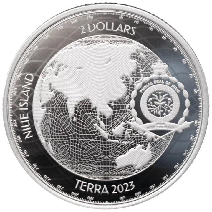 Awers ukazuje kulę ziemską, herb Niue i napisy: "NIUE ISLAND", "TERRA 2023". Na awersie znajduje się informacja wartość nominalna monety.