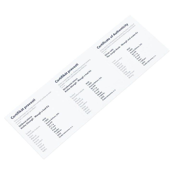 The Jungle Book - Mowgli and Snake Kaa $1 Srebro 2022 Proof jest pierwszą monetą z serii "The Jungle Book" inspirowaną książką "Księgą Dżungli" Rudyard'a Kipling'a. Chłopiec Mowgli dorasta w indyjskiej dżungli wśród zwierząt. Jego niezwykła historia zaczęła się, gdy jako maluch uciekł ze szponów tygrysa Sher Khana i został członkiem watahy wilków.