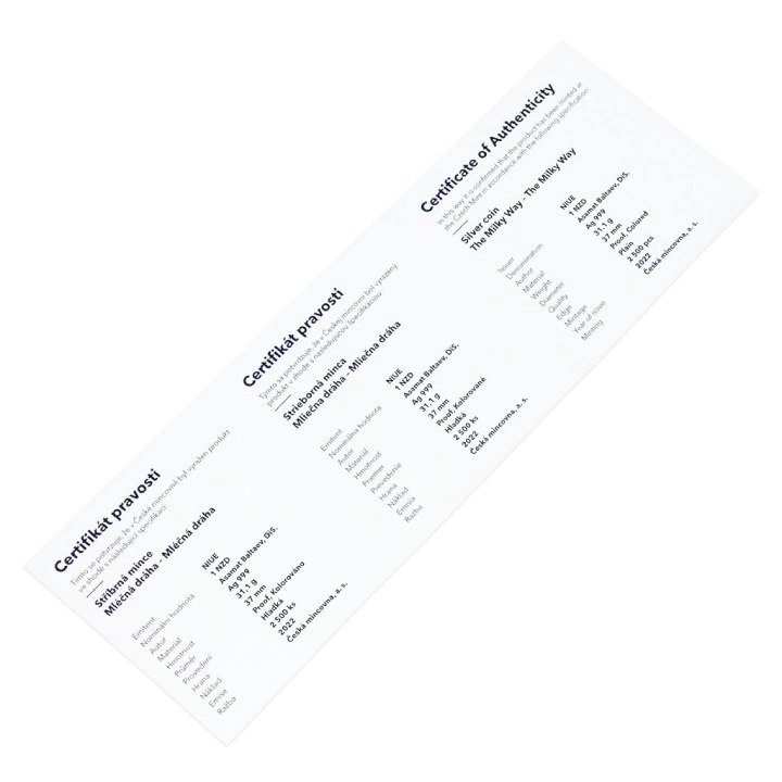 Niue: The Milky Way - The Milky Way kolorowany $1 Srebro 2022 Proof jest drugą monetą z serii "The Milky Way". Walor prezentuje Drogę Mleczną. Jest to galaktyka, w której znajduje się Słońce i Układ Słoneczny. Z Ziemi można ją zobaczyć jako srebrzysty pas łączących się gwiazd na niebie.