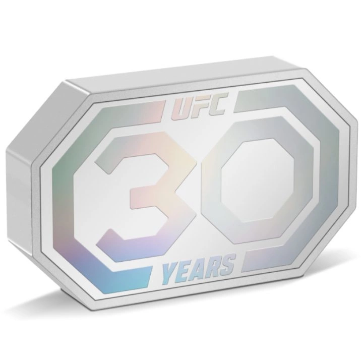 Niue: UFC - 30. rocznica kolorowany 1 uncja Srebra 2023 Proof to egzemplarz, który świętuje 30. rocznicę pierwszej gali UFC. Co ważne, ta wyjątkowa kolorowana emisja posiada ściśle limitowany nakład liczący jedynie 1 993 sztuk.