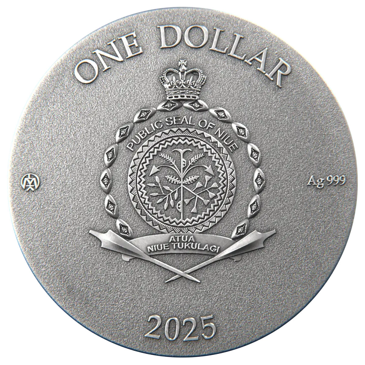 Awers: W centrum znajduje się herb Niue, nad którym widnieje wartość nominalna 1 Dollar, a poniżej rok emisji 2025. Po prawej stronie umieszczono informację o próbie srebra, a po lewej logo mennicy Lithuanian Mint – całość tworzy harmonijny i czytelny układ.