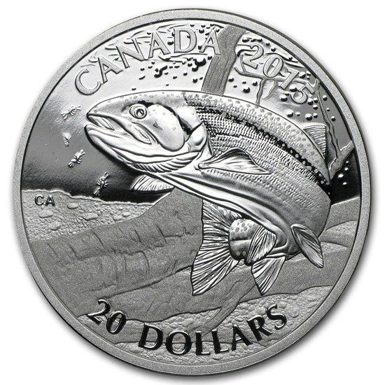 Srebrna moneta z wizerunkiem Pstrąga tęczowego to okaz o wadze jednej uncji srebra należącej do serii North American Sportfish. Producentem serii jest ceniona kanadyjska mennica, Royal Canadian Mint.
