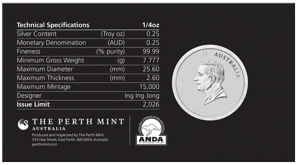 Moneta wybita została ze srebra próby 9999, o wadze 7,777 g i średnicy 25,60 mm. Stempel lustrzany z barwną aplikacją doskonale podkreśla szczegóły projektu, a limitowany nakład wynosi jedynie 15 000 sztuk, z czego na potrzeby tego wydania przeznaczono 2 026 egzemplarzy. Każdy egzemplarz zapakowany jest w estetyczne opakowanie prezentacyjne w formie karty z motywem Hobart Money Expo 2025, które podkreśla kolekcjonerski charakter monety.
