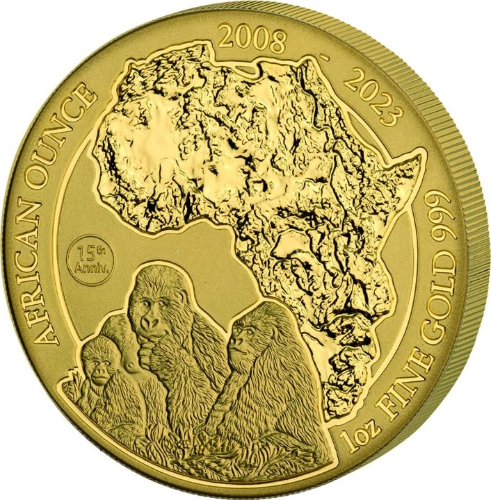 Rwanda: African Ounce -15th Anniversary Mountain Gorilla 1 uncja Złota 2023 to unikalny produkt pochodzący z powstałej w 2008 roku ekskluzywniej kolekcji African Ounce. W 2023 obchodzona jest 15. rocznica bicia monet. Wspomniany egzemplarz jest już siedemnastą odsłoną kolekcji.