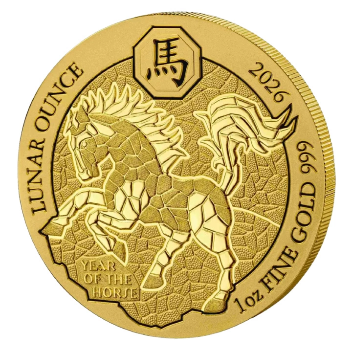 Rewers monety przedstawia dynamicznie ukazanego konia – symbol siły, pasji i niezależności – zbudowanego z wielokątnych płaszczyzn, na tle mozaikowego wzoru. U góry znajduje się chiński znak „馬” (koń), a po lewej napis LUNAR OUNCE. U dołu widnieje napis YEAR OF THE HORSE, zaś po prawej stronie podano rok emisji „2026” oraz wagę i próbę złota: „1 oz FINE GOLD 999”.
