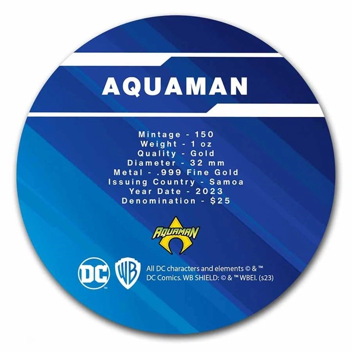 Samoa: DC Comics - Aquaman 1 uncja Złota 2023 to złota bulionowa moneta, która stanowi nie lada gratkę dla kolekcjonerów oraz fanów Uniwersum DC! Złota moneta z 2023 roku zawiera wizerunek Aquaman'a, czyli jednego z najbardziej popularnych superbohaterów całego Uniwersum.
