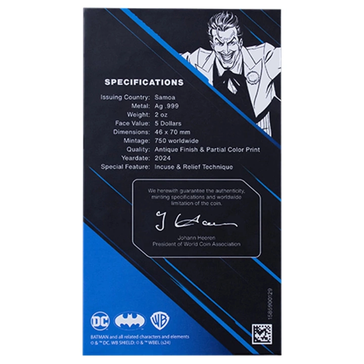 Samoa: DC Comics - Batman vs. Joker kolorowany 2 uncje Srebra 2024 Antiqued Coin to srebrna, bulionowa moneta, która stanowi nie lada gratkę dla kolekcjonerów oraz fanów Uniwersum DC! Srebrna moneta z 2024 roku zawiera wizerunek Jokera oraz Batmana, czyli jednych z najbardziej popularnych postaci całego Uniwersum.