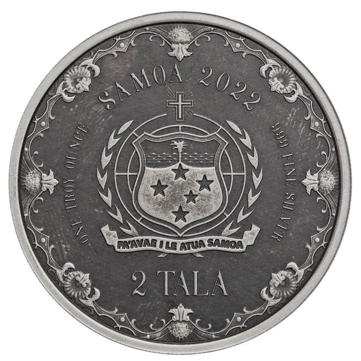 Awers srebrnej monety przedstawia herb wysp Samoa wraz z informacją o kraju emitenta, roku bicia, czystości kruszcu i wartości nominalnej.