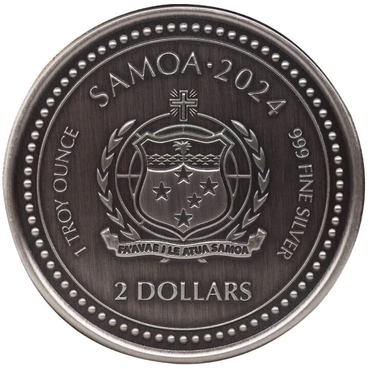 Awers srebrnej monety przedstawia herb wysp Samoa wraz z informacją o kraju emitenta, roku bicia, czystości kruszcu i wartości nominalnej.