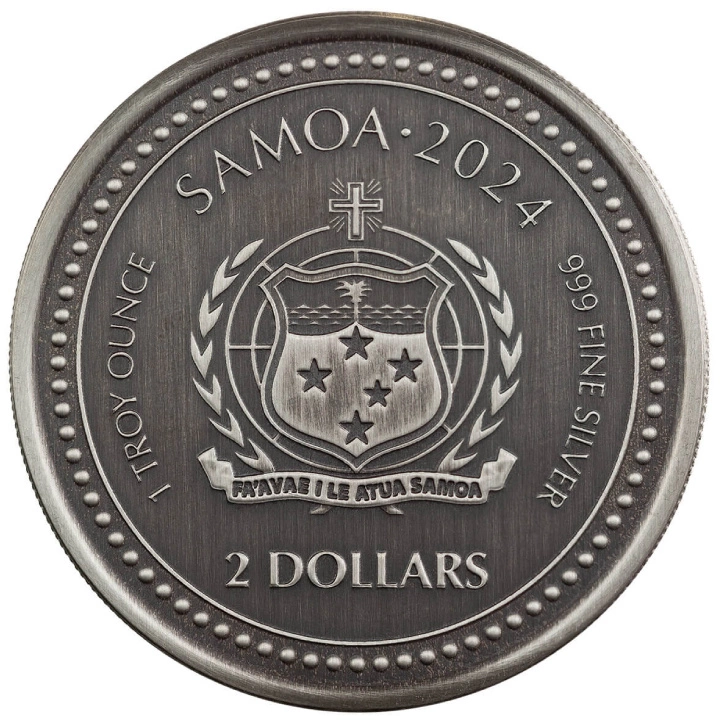 Awers srebrnej monety przedstawia herb Samoa oraz napis "SAMOA 2024". Na awersie znajduje się także informacja o kraju emitenta, wartości nominalnej monety, wadze, czystości kruszcu.