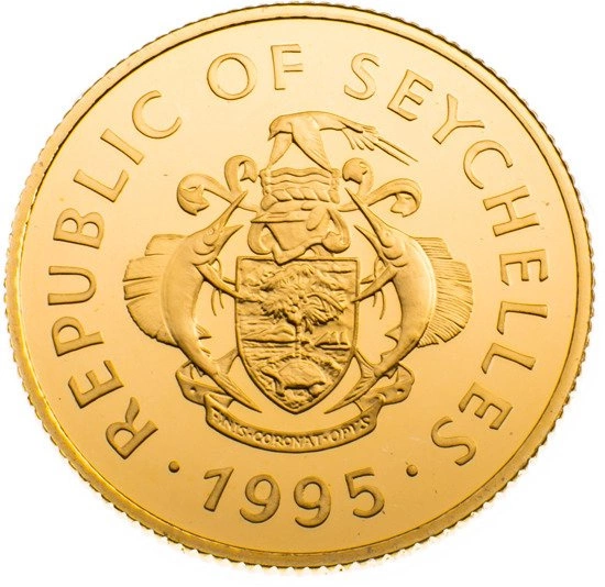 Awers monety zdobi ilustracja Narodowy Herb Seszele, w okół widnieje rok bicia oraz napis REPUBLIC OF SEYCHELLES.