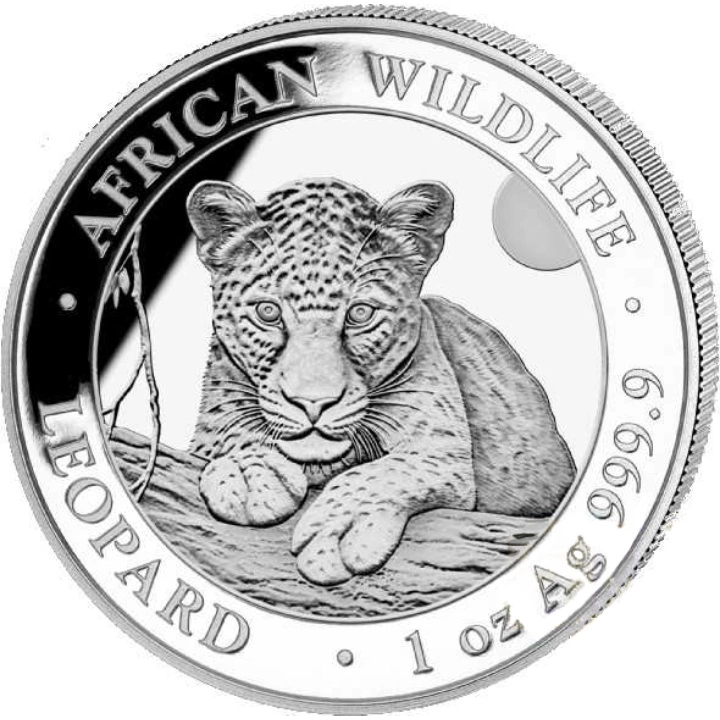 Awers srebrnej monety z serii African Wildlife Leopard 2025 przedstawia herb Somalii, na którym są ukazane dwa lamparty podtrzymujące tarczę z białą gwiazdą. Na awersie znajduje się także informacja o data emisji i wartości nominalnej monety.