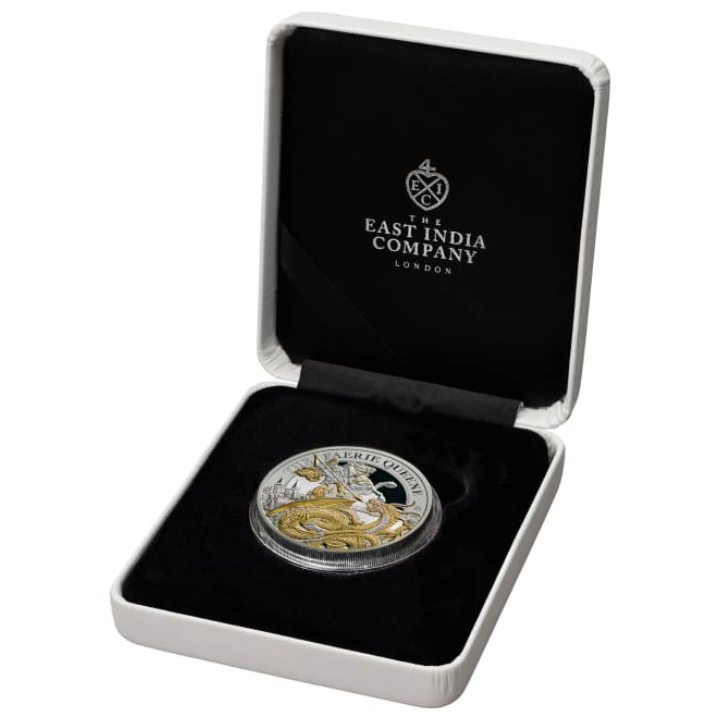 St Helena: Faerie Queene - Redcrosse & The Dragon pozłacany 2 uncje Srebra 2024 Proof to trzecia odsłona z serii The Faerie Queene. Walor nawiązuje do dzieła, czyli pierwszej księgi Edmunda Spensera, która opowiada historię rycerza Redcrosse'a, dotyczącą uratowaniu rodziców Uny z niewoli złego smoka. Rycerz dokonał tego działania poprzez prośbę Królowej Faerie. Cała seria będzie skupiać się na różnych historiach rycerzy, księżniczek, jak również na mitycznych bestiach, magicznych złoczyńcach, honorze, zdradzie, miłości i stracie.