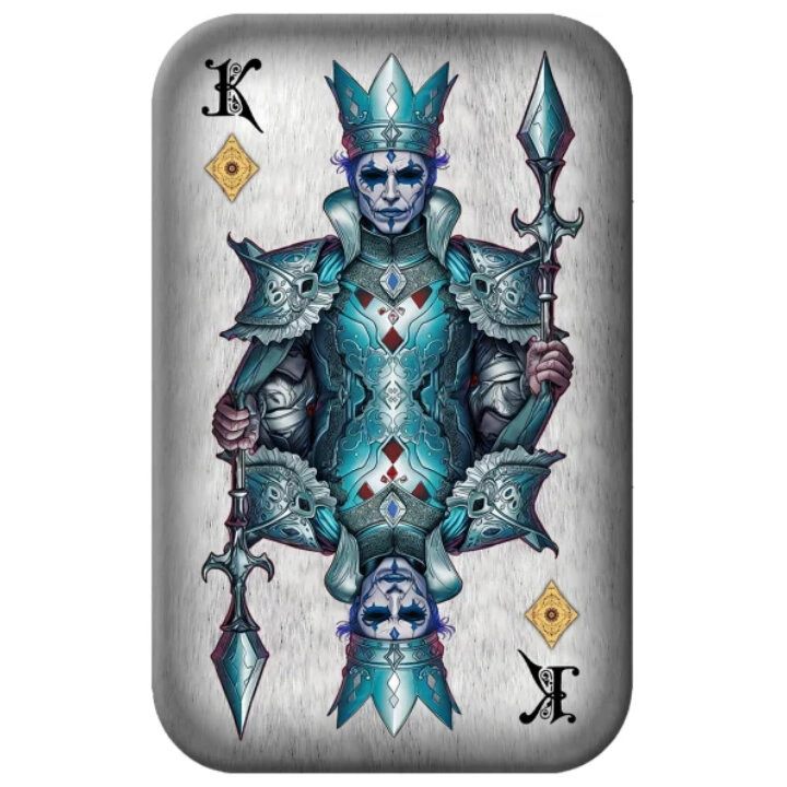 Rewers sztabki ukazuje kolorowanego Króla Karo (King of Diamonds) – jedną z najbardziej rozpoznawalnych i prestiżowych kart w talii pokerowej. Projekt łączy precyzję detali z nowoczesną kolorystyką, tworząc wyjątkową sztukę numizmatyczną.