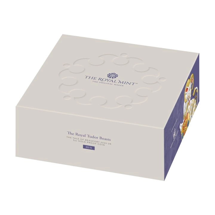 Moneta The Royal Tudor Beasts: The Yale of Beaufort 5 uncji Złota 2023 Proof to trzeci egzemplarz z serii The Royal Tudor Beasts. Moneta kolekcjonerska, ukazuje wizerunek jednego z dziesięciu heraldycznych Królewskich Bestii - The Yale of Beaufort. Produkt umożliwia zainteresowanie się niezwykle ciekawą historią Wielkiej Brytanii.