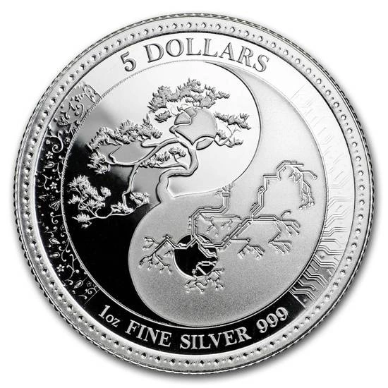 Rewers ukazuje napis "EQUILIBRIUM" oraz symbol Yin i Yang, jako równowagę pomiędzy środowiskiem a technologią. Na rewersie znajduje się informacja o wadze, próbie kruszcu oraz wartości nominalnej waloru.