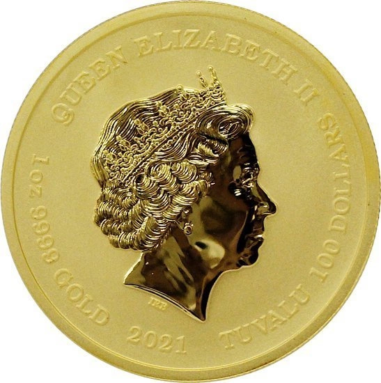 Awers złotej monety przedstawia portret Królowej Elżbiety II oraz informacja o wartości nominalnej, wadze, próbie wybicia waloru oraz dacie jego emisji.