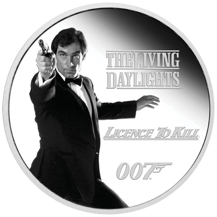 Rewers srebrnej monety przedstawia Timothy'ego Dalton'a jako agenta 007. Projektantem rewersu był Lucas Bowers.