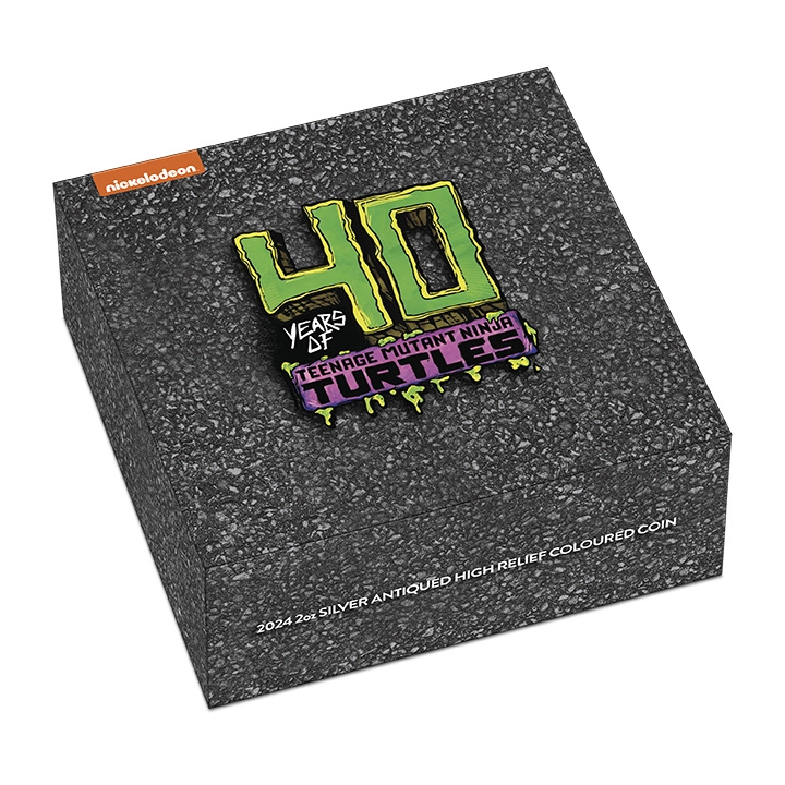 Kolekcjonerska moneta Tuvalu: Teenage Mutant Ninja Turtles - 40. rocznica 2 uncje Srebra 2024 High Relief to limitowany egzemplarz, który świętuje 40 lat przygód Żółwi Ninja. To grupa superbohaterów występująca w komiksach, filmach, serialach animowanych i grach wideo. Są to cztery antropomorficzne żółwie: Leonardo, Donatello, Raphael i Michelangelo, które zostały mutowane w wyniku ekspozycji na toksyczną substancję i pod wpływem sztuki ninjutsu, którą nauczył je szczur o imieniu Splinter, stały się niezwykle zdolnymi wojownikami.