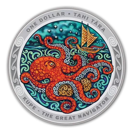 Wielki Nawigator Kupe: Zestaw 2 monet kolorowanych 2 uncje Srebra 2019 to zestaw, który przedstawia Wielkiego Nawigatora Kupe, który odkrył wyspy Nowej Zelandii. Zestaw ten będzie znakomitym uzupełnieniem każdej kolekcji. Monety posiadają nominał o wartości $1. Zestaw posiada limitowany nakład, liczący jedyne 500 sztuk.