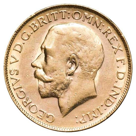 Awers złotej Suwereny przedstawia portret Króla Jerzego V.
